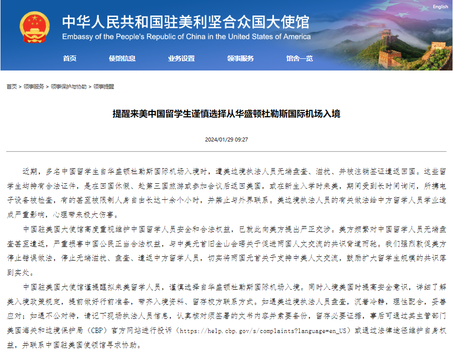 中國駐美國大使館官網截圖 據中國駐美國大使館官網消息,近期,多名中國留學生自華盛頓杜勒斯國際機場入境時,遭美邊境執法人員無端盤查、滋擾、並被註銷簽證遣返回國。這些留學生均持有合法證件,是在回國休假、赴第三國旅遊或參加會議後返回美國,或在新生入學時來美,期間受到長時間詢問,所攜電子設備被檢查,有的甚至被限制人身自由長達十餘個小時,並禁止與外界聯繫。美邊境執法人員的有關做法給中方留學人員學業造成嚴重影響,心理帶來極大傷害。 中國駐美國大使館高度重視維護中國留學人員安全和合法權益,已就此向美方提出嚴正交涉。美方頻繁對中國留學人員無端盤查甚至遣返,嚴重損害中國公民正當合法權益,與中美元首舊金山會晤關於促進兩國人文交流的共識背道而馳。我們強烈敦促美方停止錯誤做法,停止無端滋擾、盤查、遣返中方留學人員,切實將兩國元首關於支持中美人文交流,鼓勵擴大留學生規模的共識落到實處。 中國駐美國大使館謹提醒擬來美留學人員,謹慎選擇自華盛頓杜勒斯國際機場入境。同時入境美國時提高安全意識,詳細了解美入境政策規定,提前做好行前準備,帶齊入境資料、留存校方聯繫方式。如遇美邊境執法人員盤查,沉著冷靜,理性配合,妥善應對;如遇不公對待,請記下現場執法人員信息,認真核對須簽署的文書內容並索要備份,留存必要證據,事後可通過其主管部門美國海關和邊境保護局(CBP)官方網站進行投訴(https://help.cbp.gov/s/complaints?language=en_US)或通過法律途徑維護自身權益,並聯繫中國駐美國使領館尋求協助。(完) 【編輯:丘志彬】