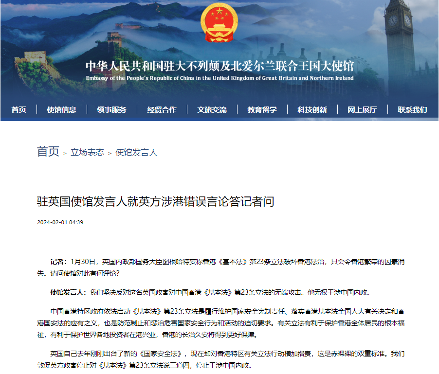 中國駐英國大使館網站截圖 記者:1月30日,英國內政部國務大臣圖根哈特妄稱香港《基本法》第23條立法破壞香港法治,只會令香港繁榮的因素消失。請問使館對此有何評論? 使館發言人:我們堅決反對這名英國政客對中國香港《基本法》第23條立法的無端攻擊。他無權干涉中國內政。 中國香港特區政府依法啟動《基本法》第23條立法是履行維護國家安全憲制責任、落實香港基本法全國人大有關決定和香港國安法的應有之義,也是防範制止和懲治危害國家安全行為和活動的迫切要求。有關立法有利於保護香港全體居民的根本福祉,有利於保護世界各地投資者在港興業,香港的長治久安將得到更好保障。 英國自己去年剛剛出臺了新的《國家安全法》,現在卻對香港特區有關立法行動橫加指責,這是赤裸裸的雙重標準。我們敦促英方政客停止對《基本法》第23條立法說三道四,停止干涉中國內政。(完) 【編輯:丘志彬】