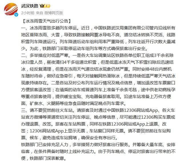 香港新聞網2月4日電 據中國鐵路武漢局集團有限公司官方微博4日發佈公告稱,冰凍雨雪致多趟列車停運。