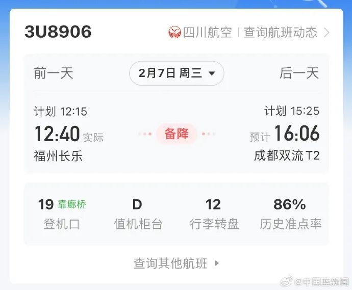 香港新聞網2月7日電 今天(2月7日),四川航空一架航班號為3U8906的航班,原計劃由福州長樂機場飛往成都雙流機場。目前實時數據顯示,該航班已備降廣州白雲機場。據了解,稍早前3U8906航班掛出7700緊急代碼。