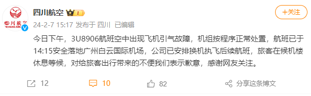 隨後,四川航空在微博通報,今日下午,3U8906航班空中出現飛機引氣故障,機組按程序正常處置,航班已於14:15安全落地廣州白雲國際機場,公司已安排換機執飛後續航班,旅客在候機樓休息等候,對給旅客出行帶來的不便我們表示歉意,感謝網友關注。