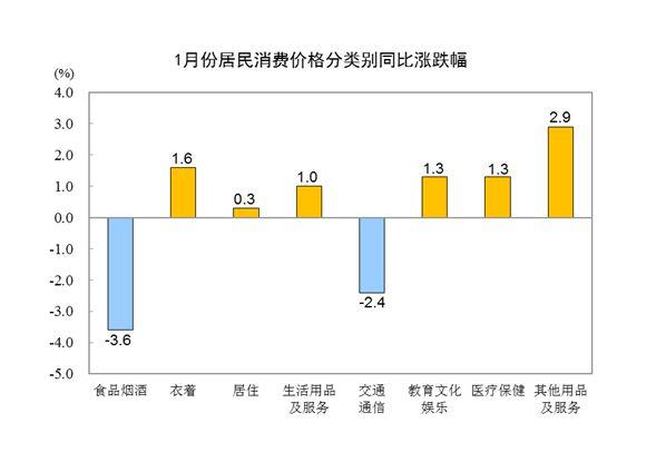 中國國家統計局網站截圖 各類商品及服務價格同比變動情況 1月份,食品煙酒類價格同比下降3.6%,影響CPI下降約1.04個百分點。食品中,受上年同期對比基數較高影響,鮮菜價格下降12.7%,影響CPI下降約0.32個百分點;畜肉類價格下降11.6%,影響CPI下降約0.39個百分點,其中豬肉價格下降17.3%,影響CPI下降約0.25個百分點;鮮果價格下降9.1%,影響CPI下降約0.21個百分點;蛋類價格下降6.4%,影響CPI下降約0.05個百分點;水產品價格下降3.4%,影響CPI下降約0.07個百分點。 其他七大類價格同比六漲一降。其中,其他用品及服務、衣著價格分別上漲2.9%和1.6%,教育文化娛樂、醫療保健價格均上漲1.3%,生活用品及服務、居住價格分別上漲1.0%和0.3%;交通通信價格下降2.4%。