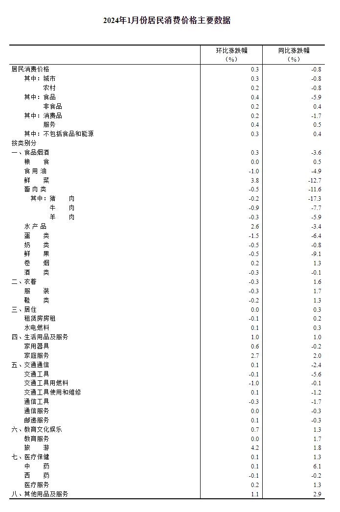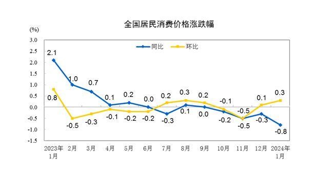 香港新聞網2月8日電 據中國國家統計局網站消息,2024年1月份,受節日效應影響居民消費需求持續增加,全國居民消費價格環比上漲0.3%,已連續兩個月上漲,漲幅比上月擴大0.2個百分點。其中,城市上漲0.3%,農村上漲0.2%;食品價格上漲0.4%,非食品價格上漲0.2%;消費品價格上漲0.2%,服務價格上漲0.4%。 1月份,受上年同期春節錯月高基數影響,全國居民消費價格同比下降0.8%。其中,城市下降0.8%,農村下降0.8%;食品價格下降5.9%,非食品價格上漲0.4%;消費品價格下降1.7%,服務價格上漲0.5%。在1月份-0.8%的CPI(居民消費價格指數)同比變動中,翹尾影響約為-1.1個百分點;今年價格變動的新影響約為0.3個百分點。