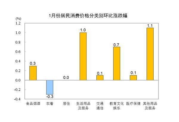 中國國家統計局網站截圖 各類商品及服務價格環比變動情況 1月份,食品煙酒類價格環比上漲0.3%,影響CPI上漲約0.09個百分點。食品中,寒潮天氣加之春節臨近消費需求增加,鮮菜價格上漲3.8%,影響CPI上漲約0.08個百分點;水產品價格上漲2.6%,影響CPI上漲約0.05個百分點。各地積極加大民生商品供應,蛋類價格下降1.5%,影響CPI下降約0.01個百分點;鮮果價格下降0.5%,影響CPI下降約0.01個百分點;畜肉類價格下降0.5%,影響CPI下降約0.01個百分點。 其他七大類價格環比五漲一平一降。其中,其他用品及服務、生活用品及服務、教育文化娛樂價格分別上漲1.1%、1.0%和0.7%,交通通信、醫療保健價格均上漲0.1%;居住價格持平;衣著價格下降0.3%。