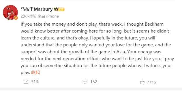 微博截圖 馬布里在微博以英文發文說,“如果你收了錢卻不出場,那就太瘋狂了。我原以為貝克漢姆來(中國)這麼久了應該更懂,但他似乎沒學到這裡的文化,這沒關係。希望在未來你會明白,人們只想看到你對比賽的熱愛,支持是為了這項運動在亞洲的發展。那些想像你一樣的孩子,他們需要你的能量。我希望你知道,人們想要看你踢球”。英格蘭足球名宿貝克漢姆是邁阿密國際俱樂部主席。 8日中午,馬布里又轉發中國球迷微博,並用英文表達了他對在北京隊籃球生涯的熱愛,“北京是我的家,永遠不會改變”。 7日晚,邁阿密國際與神戶勝利船隊在日本東京進行了一場表演賽,梅西替補登場。而4日晚與中國香港明星隊的比賽,也成了邁阿密國際此行6場表演賽中,梅西唯一避戰的比賽。 馬布里1977年生於紐約,司職控球後衛,效力NBA時期綽號“獨狼”,曾2次入選NBA全明星陣容。馬布里已在中國生活多年,曾幫助北京北汽男籃(原北京首鋼男籃)在CBA賽場取得“四年三冠”偉業。對中國感情深厚的馬布里是首位獲得中國“綠卡”的CBA外援,並成為北京市榮譽市民。他去年11月還向香港人才服務辦公室遞交了“高端人才通行證計劃”的申請。(完) 【編輯:凌玉辉】