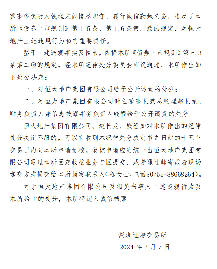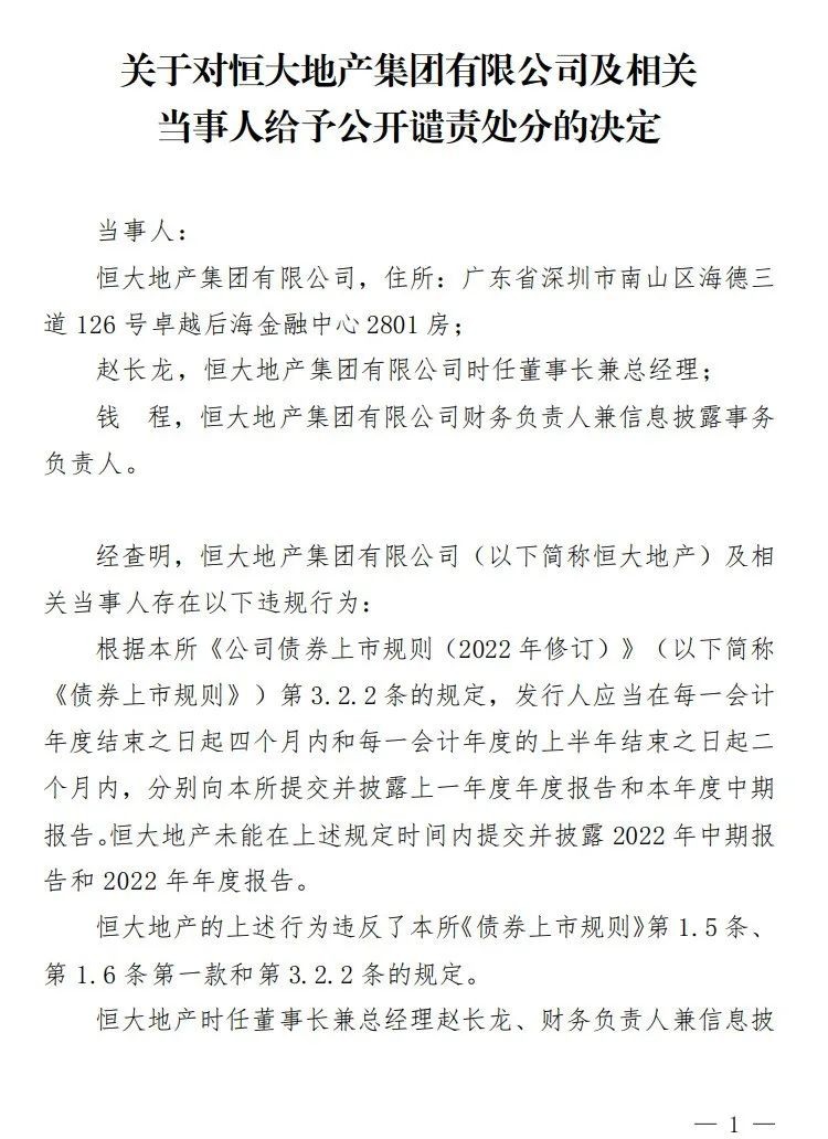 經查明,恒大地產及相關當事人存在以下違規行為:恒大地產未能在規定時間內提交並披露2022年中期報告和2022年年度報告。恒大地產時任董事長兼總經理趙長龍、財務負責人兼信息披露事務負責人錢程對恒大地產上述違規行為負有重要責任。 深交所決定,對恒大地產給予公開譴責的處分;對恒大地產時任董事長兼總經理趙長龍、財務負責人兼信息披露事務負責人錢程給予公開譴責的處分。 對於恒大地產及相關當事人上述違規行為及給予的處分,深交所將記入誠信檔案。