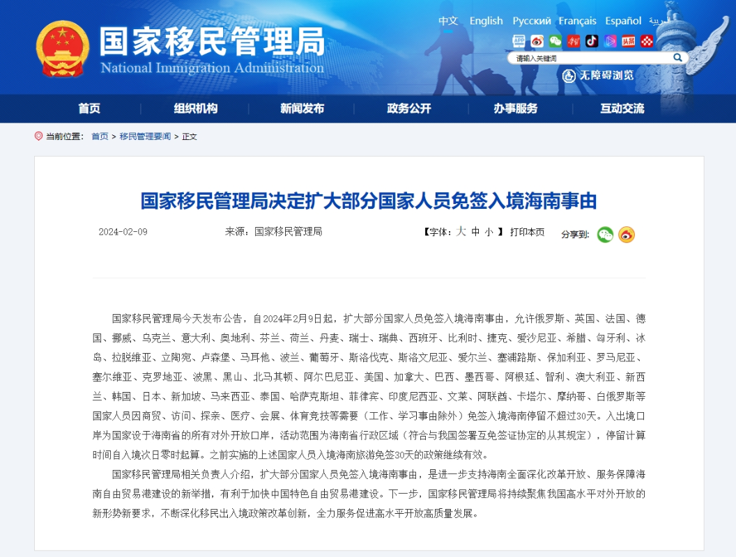 中國國家移民管理局:部分國家人員可以用更多事由免簽入境海南分享到: