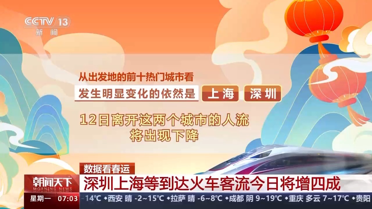 大年初三人都去哪兒了?春運熱力圖帶你看“流動中國”香港新聞網2月12日電 今天(12日)是大年初三,按照往年的規律,中國內地今天的人流將出現明顯的分化,節前返鄉的人們開始陸續返程,同時假期旅遊也進入高峰,實際情況如何?我們繼續通過春運熱力圖來了解。 據央視新聞客戶端報道,昨天選擇乘坐火車出行的旅客大約有920萬人次,相比大年初一,客流量增加七成左右,根據12306的預售數據預測,今天的火車客流量將繼續增加。 從今天的春運熱力圖看,初三的流量將比昨天增長四分之一左右。雖然距離春運高峰時還有差距,但已經基本相當於臘月二十三時的火車客流。 深圳上海等到達火車客流今日將增四成 今天排名前十的熱門目的地變化不大,但從它們的增幅看,深圳、上海的增幅最高,到達這裏的火車客流量將增長四成,尤其是深圳,已經連續兩天明顯回流。