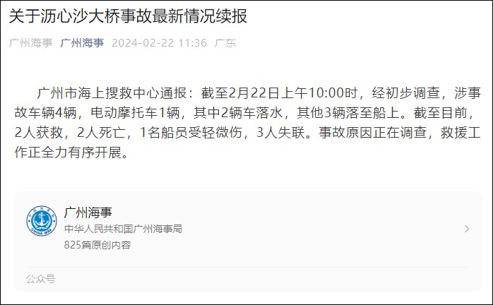 香港新聞網2月22日電 微信公眾號“廣州海事”22日發佈《關於瀝心沙大橋事故最新情況續報》。 “廣州海事”稱,廣州市海上搜救中心通報:截至2月22日上午10:00時,經初步調查,涉事故車輛4輛,電動摩托車1輛,其中2輛車落水,其他3輛落至船上。截至目前,2人獲救,2人死亡,1名船員受輕微傷,3人失聯。事故原因正在調查,救援工作正全力有序開展。