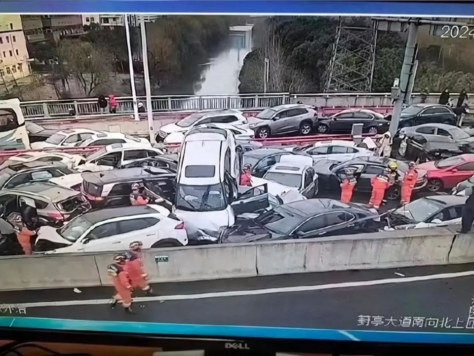 事發現場圖 @新京報我們視頻 截圖 @江蘇新聞 報道,2月23日上午7時,蘇州工業園區星港街高架段,因道路結冰,發生100多台車輛碰撞事故,部分駕駛員乘客輕傷,無重大人員傷亡。目前,警保人員已介入跟進事故定責。