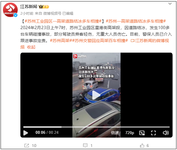據央視新聞此前報道,2024年2月23日上午7時許,蘇州工業園區婁江快速路高架段,因道路結冰,發生多台車輛碰撞事故,有人員受傷。