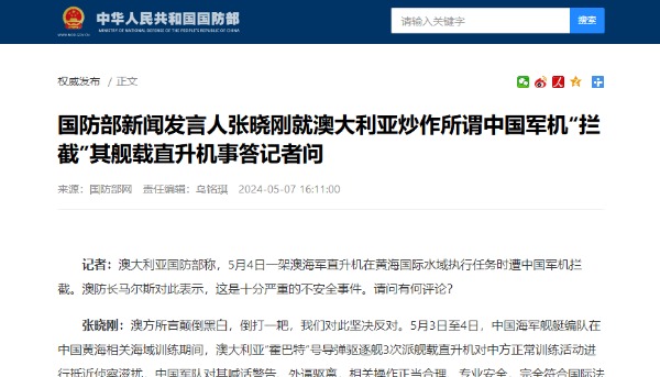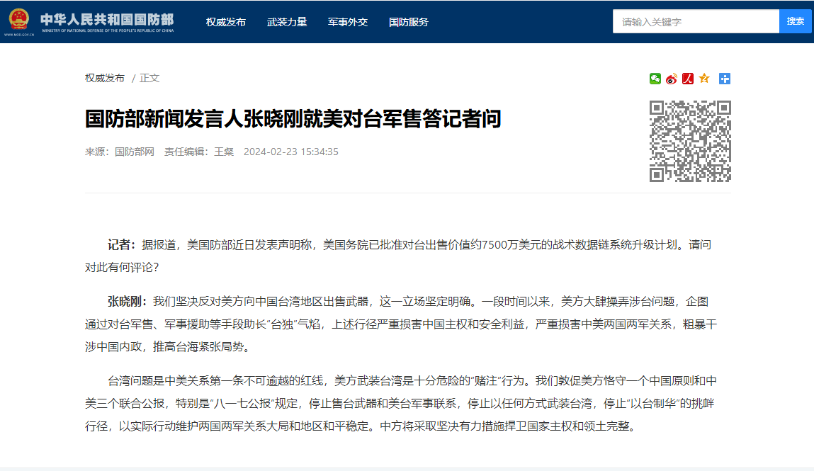 中國國防部網站截圖 記者:據報道,美國防部近日發表聲明稱,美國務院已批准對台出售價值約7500萬美元的戰術數據鏈系統昇級計劃。請問對此有何評論? 張曉剛:我們堅決反對美方向中國台灣地區出售武器,這一立場堅定明確。一段時間以來,美方大肆操弄涉台問題,企圖通過對台軍售、軍事援助等手段助長“台獨”氣焰,上述行徑嚴重損害中國主權和安全利益,嚴重損害中美兩國兩軍關係,粗暴干涉中國內政,推高台海緊張局勢。 台灣問題是中美關係第一條不可逾越的紅線,美方武裝台灣是十分危險的“賭注”行為。我們敦促美方恪守一個中國原則和中美三個聯合公報,特別是“八一七公報”規定,停止售台武器和美台軍事聯繫,停止以任何方式武裝台灣,停止“以台制華”的挑釁行徑,以實際行動維護兩國兩軍關係大局和地區和平穩定。中方將採取堅決有力措施捍衛國家主權和領土完整。(完) 【編輯:丘志彬】