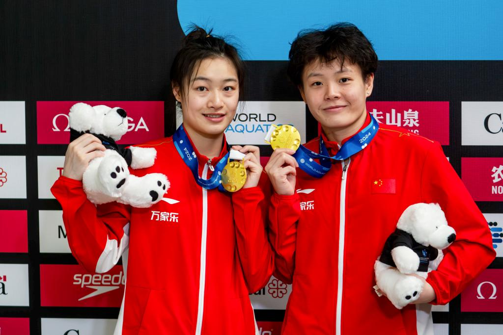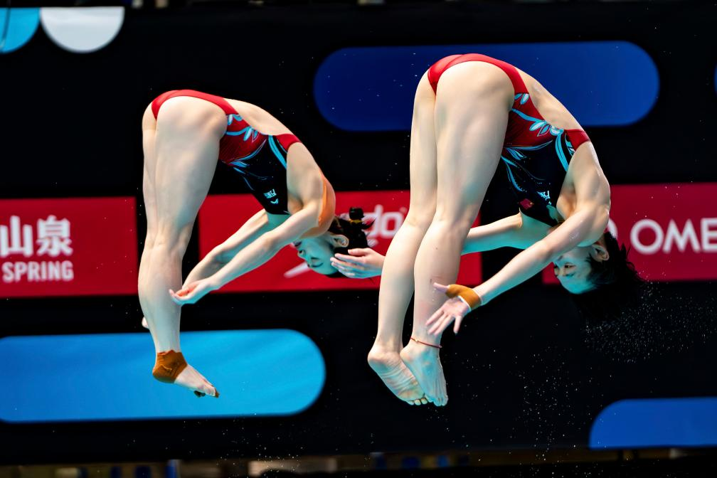 3月3日,中國選手昌雅妮(左)/陳藝文在女子雙人3米板比賽中。新華社發(劉佳歡攝) 在當日進行的女子雙人3米板決賽中,中國隊昌雅妮攜手陳藝文以329.40分奪得冠軍,美國和澳大利亞組合分獲二、三名。男子雙人10米台項目,中國隊練俊傑/楊昊以457.23分獲得金牌,墨西哥和英國組合分獲銀牌和銅牌。男子3米板項目,中國隊王宗源以549.50分名列第一,墨西哥和英國選手分獲二、三名,另一位中國選手鄭九源位列第四。女子10米台項目,中國名將陳芋汐最終以415.35分奪冠,全紅嬋緊隨其後,以411.45分的成績獲得亞軍。