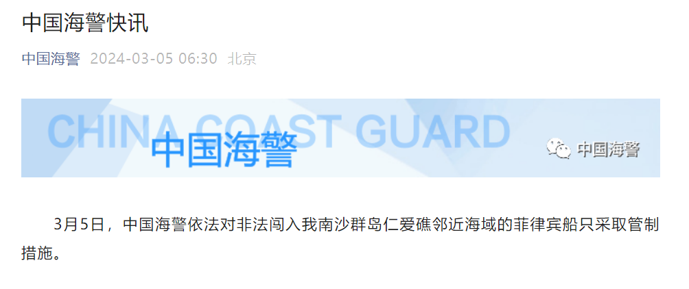 香港新聞網3月5日電 據中國海警微信公眾號消息,3月5日,中國海警依法對非法闖入我南沙群島仁愛礁鄰近海域的菲律賓船隻採取管制措施。