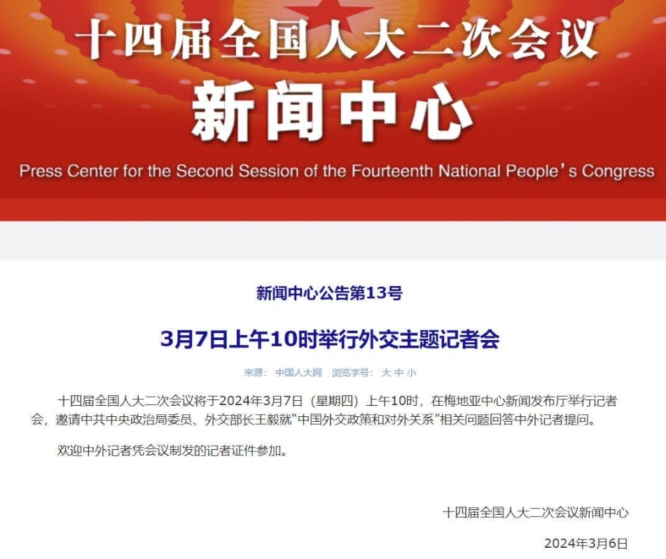 十四屆全國人大二次會議將於2024年3月7日(星期四)上午10時,在梅地亞中心新聞發布廳舉行記者會,邀請中共中央政治局委員、外交部長王毅就“中國外交政策和對外關係”相關問題回答中外記者提問。