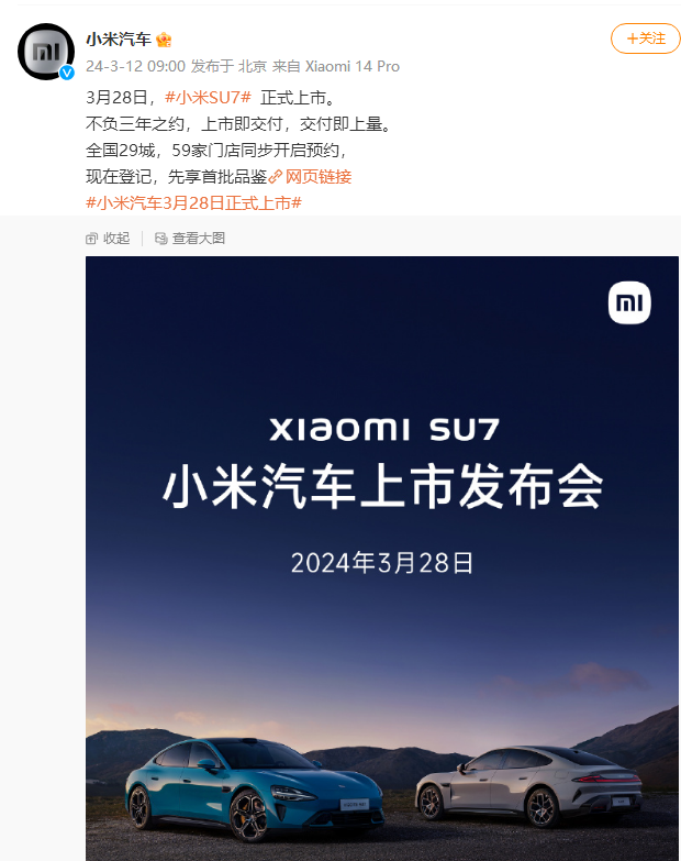 香港中通社3月12日電 中國智能手機製造商小米集團創始人雷軍12日在個人微博發文說,“3月28日,小米SU7正式發布,這是我們的三年之約。” 小米汽車同日也在官方微博發文宣布,小米SU7在3月28日正式上市。並稱:“不負三年之約,上市即交付,交付即上量。全國29城,59家門店同步開啟預約。”