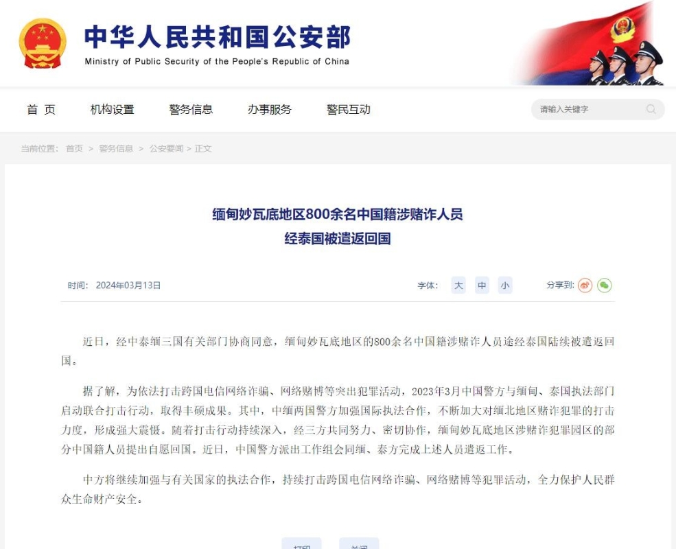 中國公安部網站截圖 據了解,為依法打擊跨國電信網絡詐騙、網絡賭博等突出犯罪活動,2023年3月中國警方與緬甸、泰國執法部門啟動聯合打擊行動,取得豐碩成果。其中,中緬兩國警方加強國際執法合作,不斷加大對緬北地區賭詐犯罪的打擊力度,形成強大震懾。隨著打擊行動持續深入,經三方共同努力、密切協作,緬甸妙瓦底地區涉賭詐犯罪園區的部分中國籍人員提出自願回國。 近日,中國警方派出工作組會同緬、泰方完成上述人員遣返工作。(完) 【編輯:丘志彬】