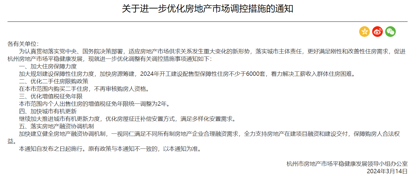資料圖為杭州。杭州網 全文如下: 為認真貫徹落實黨中央、國務院決策部署,適應房地產市場供求關係發生重大變化的新形勢,落實城市主體責任,更好滿足剛性和改善性住房需求,促進杭州房地產市場平穩健康發展,現就進一步優化調整有關調控措施事項通知如下: 一、加大住房保障力度 加大規劃建設保障性住房力度,加快房源籌建,2024年開工建設配售型保障性住房不少於6000套,著力解決工薪收入群體住房困難。 二、優化二手住房限購政策 在本市範圍內購買二手住房,不再審核購房人資格。 三、優化增值稅征免年限 本市範圍內個人出售住房的增值稅征免年限統一調整為2年。 四、加快城市有機更新 繼續加大推進城市有機更新力度,優化房屋征遷補償安置方式,滿足多樣化安置需求。 五、落實房地產融資協調機制 加快建立健全房地產融資協調機制,一視同仁滿足不同所有制房地產企業合理融資需求,全力支持房地產在建項目融資和建設交付,保障購房人合法權益。 本通知自發佈之日起施行。原有政策與本通知不一致的,以本通知為準。