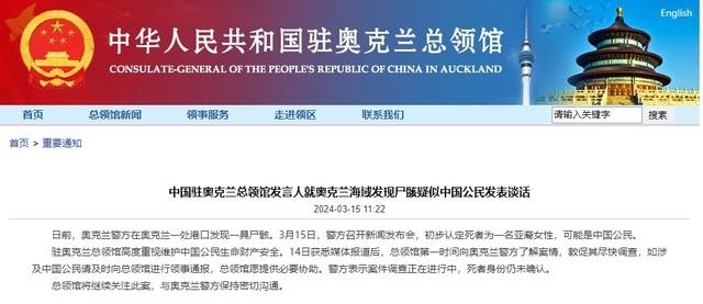 中國駐奧克蘭總領館高度重視維護中國公民生命財產安全。14日獲悉媒體報道後,總領館第一時間向奧克蘭警方了解案情,敦促其盡快調查,如涉及中國公民請及時向總領館進行領事通報,總領館願提供必要協助。警方表示案件調查正在進行中,死者身份仍未確認。 總領館將繼續關注此案,與奧克蘭警方保持密切溝通。(完) 【編輯:丘志彬】