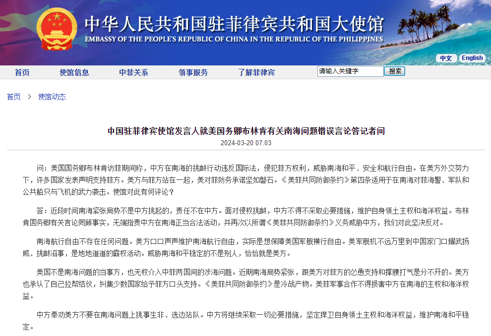 中國駐菲律賓大使館網站截圖 有記者問:美國國務卿布林肯訪菲期間稱,中方在南海的挑釁行動違反國際法,侵犯菲方權利,威脅南海和平、安全和航行自由。在美方外交努力下,許多國家發表聲明支持菲方。美方與菲方站在一起,美對菲防務承諾堅如磐石。《美菲共同防禦條約》第四條適用於在南海對菲海警、軍隊和公共船隻與飛機的武力襲擊。使館對此有何評論? 發言人表示,近段時間南海緊張局勢不是中方挑起的,責任不在中方。面對侵權挑釁,中方不得不采取必要措施,維護自身領土主權和海洋權益。布林肯國務卿有關言論罔顧事實,無端指責中方在南海正當合法活動,并再次以所謂《美菲共同防禦條約》義務威脅中方,我們對此堅決反對。 發言人稱,南海航行自由不存在任何問題。美方口口聲聲維護南海航行自由,實際是想保障美國軍艦橫行自由。美軍艦機不遠萬里到中國家門口耀武揚威、挑釁滋事,是地地道道的霸權活動。威脅南海和平穩定的不是別人,恰恰就是美方。 發言人指出,美國不是南海問題的當事方,也無權介入中菲兩國間的涉海問題。近期南海局勢緊張,跟美方對菲方的慫恿支持和撐腰打氣是分不開的。美方也承認了自己拉幫結夥,糾集少數國家給予菲方口頭支持。《美菲共同防禦條約》是冷戰產物。美菲軍事合作不得損害中方在南海的主權和海洋權益。 發言人強調,中方奉勸美方不要在南海問題上挑事生非、選邊站隊。中方將繼續采取一切必要措施,堅定捍衛自身領土主權和海洋權益,維護南海和平穩定。(完) 【編輯:丘志彬】