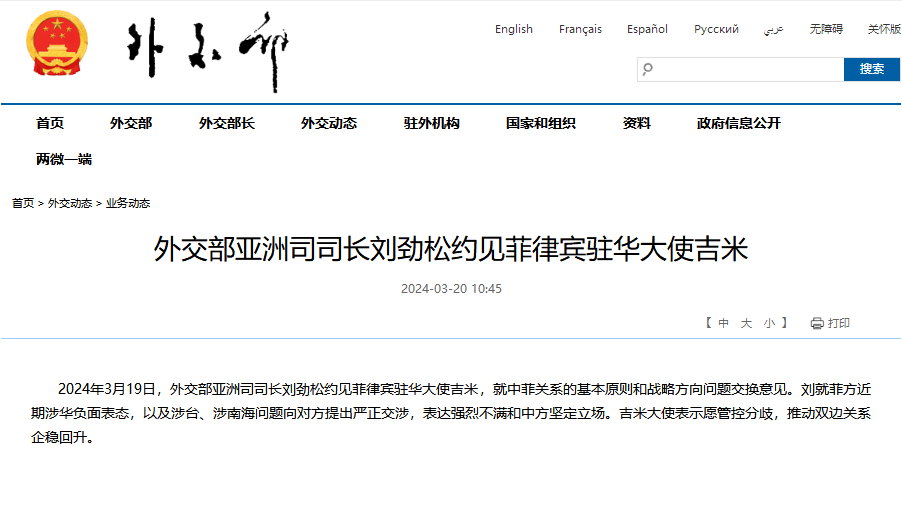 香港新聞網3月20日電 據中國外交部網站3月20日消息,19日,中國外交部亞洲司司長劉勁松約見菲律賓駐華大使吉米,就中菲關係的基本原則和戰略方向問題交換意見。劉就菲方近期涉華負面表態,以及涉台、涉南海問題向對方提出嚴正交涉,表達強烈不滿和中方堅定立場。
