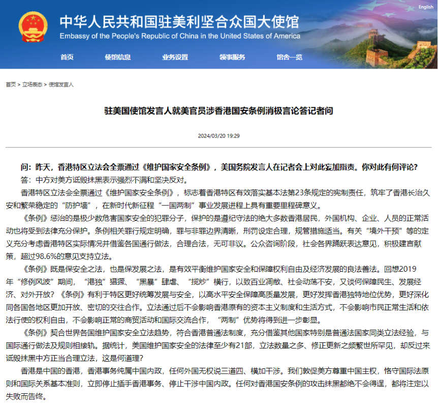 中國駐美大使館官網截圖 據中國駐美大使館官網消息,發言人說,中國香港特區立法會全票通過《維護國家安全條例》,標誌著香港特區有效落實基本法第23條規定的憲制責任,築牢了香港長治久安和繁榮穩定的“防護牆”,在新時代新征程“一國兩制”事業發展進程上具有重要里程碑意義。 《條例》懲治的是極少數危害國家安全的犯罪分子,保護的是遵紀守法的絕大多數香港居民,外國機構、企業、人員的正常活動也將受到法律充分保護。條例相關罪行規定明確,罪與非罪邊界清晰,刑罰設定合理,規管措施適當。有關“境外干預”等的定義充分考慮香港特區實際情況並借鑒各國通行做法,合理合法,無可非議。公眾諮詢階段,社會各界踴躍表達意見,積極建言獻策,超過98.6%的意見支持立法。 《條例》既是保安全之法,也是保發展之法,是有效平衡維護國家安全和保障權利自由及經濟發展的良法善法。回想2019年“修例風波”期間,“港獨”猖獗、“黑暴”肆虐、“攬炒”橫行,以致百業凋敝、社會動蕩不安,又談何保障民生、發展經濟、對外開放?《條例》有利於特區更好統籌發展與安全,以高水平安全保障高質量發展,更好發揮香港獨特地位優勢,更好深化同各國各地區更加開放、密切的交往合作。立法通過後不會影響香港原有的資本主義制度和生活方式,不會影響市民正常生活和依法行使的權利自由,不會影響正常的商貿活動和國際交流合作,“兩制”優勢將得到進一步彰顯。 《條例》契合世界各國維護國家安全立法趨勢,符合香港普通法制度,充分借鑒其他國家特別是普通法國家同類立法經驗,與國際通行做法及規則相接軌。據統計,美國維護國家安全的法律至少有21部,立法數量之多、修正更新之頻繁世所罕見,卻反過來詆毀抹黑中方正當合理立法,這是何道理? 發言人說,香港是中國的香港,香港事務純屬中國內政,任何外國無權說三道四、橫加干涉。我們敦促美方尊重中國主權,恪守國際法原則和國際關係基本準則,立即停止插手香港事務、停止干涉中國內政。任何對香港國安條例的攻擊抹黑都絕不會得逞,都將注定以失敗而告終。(完) 【編輯:丘志彬】