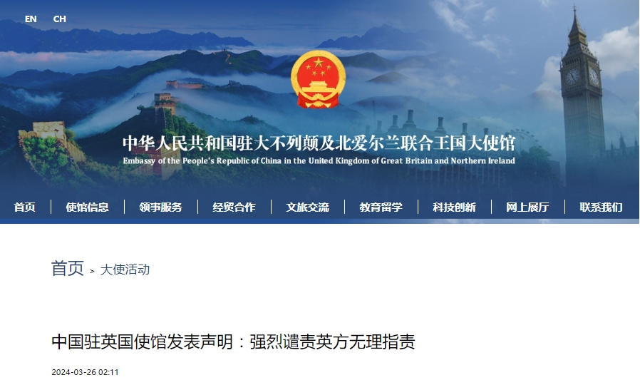 香港中通社3月26日電 中國駐英國使館26日發表聲明,對前一日英國政府在毫無根據的情況下,妄稱中國對英國實施了網絡攻擊,並宣佈對中國兩名個人和一個實體實施制裁的惡劣行徑予以強烈譴責。