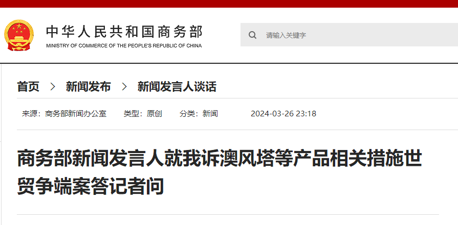 中國商務部網站截圖 記者問:據悉,近日世貿組織專家組就中方訴澳大利亞風塔等三種產品相關措施世貿爭端案發佈了有關裁決報告。請問商務部有何評論? 發言人稱,3月26日,世貿組織公佈了中國訴澳大利亞風塔等三種產品相關措施世貿爭端案的專家組報告。世貿組織裁決澳方對華風塔、鐵道輪轂和不銹鋼水槽等三種產品採取的反傾銷措施違反世貿規則。中方對專家組作出的客觀、公正裁決表示讚賞。 中方認為,專家組裁決是清楚和明確的,澳方對中國企業相關產品采取反傾銷措施的歧視性做法是錯誤的。中方希望澳方尊重裁決,盡快糾正違規做法,取消有關征稅措施,并在其他貿易救濟措施中嚴格遵守世貿規則,與中方相向而行,共同維護多邊貿易體制,推動中澳經貿關係健康發展。(完) 【編輯:丘志彬】