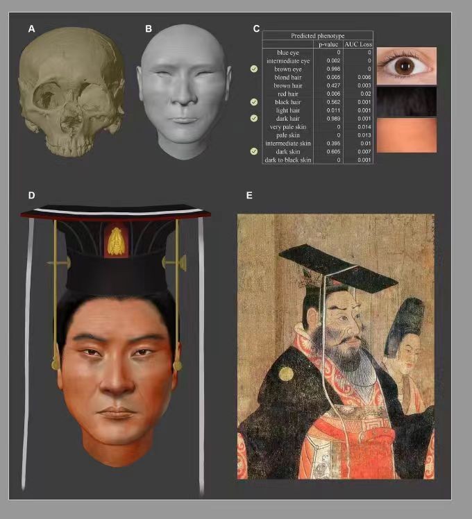 左下圖為北周武帝宇文邕容貌復原圖,右下圖為閻立本繪《歷代帝王圖》中的北周武帝宇文邕。復旦大學科技考古研究院供圖 復原中國古代帝王容貌,最大的困難在於獲得古代帝王完整的顱骨和高質量的基因組數據。幸運的是,1994年至1995年,陝西省考古研究院和鹹陽市文物考古研究所對孝陵成功進行搶救性發掘,發現了宇文邕顱骨、肢骨以及天元皇太后璽,明確了這位鮮卑族帝王的身份。 復旦大學科技考古研究院文少卿團隊用專門適用於古DNA的捕獲探針,從北周武帝肢骨樣本上獲取了約100萬個可用的基因位點,還原北周武帝頭髮、皮膚、瞳孔等關鍵特征。經過6年的反復嘗試,終於“描繪”出宇文邕頭像。 北周武帝宇文邕長什麼樣?還原後的頭像顯示:他擁有黑色頭髮、黃色皮膚和棕色眼睛,符合典型的東北亞、東亞人長相,與人們想象中鮮卑族相貌鬚髮茂盛、發色偏黃和高鼻深目大不相同。 宇文邕的形象也被唐代畫家閻立本繪於《歷代帝王圖》上。閻立本筆下的北周武帝面容豐滿、身型富態,而復原的宇文邕相貌卻清瘦精幹。 “北周武帝的家族譜系表明,他的祖母王氏可能是北方漢人。”文少卿說,“鮮卑族的形成很可能是一個動態的多民族融合的過程。” “復原北周武帝容貌,開歷史研究先河。”復旦大學歷史系教授韓昇認為,南北朝是中國歷史上影響深遠的民族大融合時期,科技考古不僅為相關歷史研究提供了證據,也增進了人們對中華民族多元一體的理解。(完) 【編輯:丘志彬】