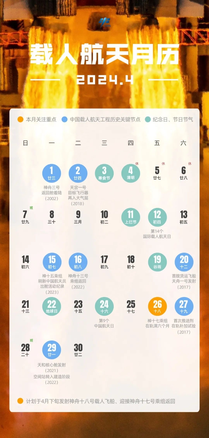中國載人航天工程版月曆:計劃於4月下旬發射神舟十八號載人飛船、迎接神舟十七號乘組返回。 中國載人航天工程新聞發言人林西強此前介紹,隨着中國空間站進入應用與發展階段,航天員乘組常態化實施輪換,乘組的在軌工作安排也趨於常態化。神十七乘組的主要任務,包括人員物資正常輪換補給、空間站組合體平台照料、乘組自身健康管理、在軌實(試)驗、開展科普及公益活動以及異常情況處置等六大類工作。 神十七“太空出差”多亮點 神十七任務目前已進入尾聲,除上述常態化工作以外,神十七航天員湯洪波、唐勝傑、江新林此次“太空出差”也有很多亮點。2023年12月21日,神十七乘組完成首次太空出艙活動,他們完成了天和核心艙太陽翼修復試驗等既定任務。2024年3月2日,神十七乘組圓滿完成第二次出艙活動,在前一次出艙維修試驗基礎上,他們重點完成了天和核心艙太陽翼維修工作,並對空間站艙體狀態進行了巡檢。這也是中國航天員首次完成在軌航天器艙外設施的維修任務。 值得一提的是,神十七任務還將首批艙外暴露實驗材料樣品成功取回。3月14日,神十七乘組與地面科研人員密切協同順利完成了首批艙外暴露實驗材料樣品取回工作。據介紹,首批材料暴露樣品總計407件,分為非金屬及金屬兩類。其中非金屬材料包括記憶聚合物材料、月壤加固材料、固體潤滑及凝膠潤滑材料,金屬材料包括鎂合金、多孔銅材料等。相關材料艙外暴露實驗研究將推動大型空間展開機構材料、空間潤滑材料、月球基地建設材料、中子屏蔽材料等先進材料的空間應用。這些樣品後續將隨神舟飛船返回地面,由科學家進一步開展地面研究工作。 神十七乘組自進駐中國空間站以來,進行了大量空間科學實(試)驗項目,包括涵蓋空間生命科學與人體研究、空間微重力物理、空間天文與地球科學、空間新技術與應用等領域。在任務期間,中國空間站在軌腦電測試實驗完成第一階段的目標任務,建立了安全可靠、便攜易用的空間腦電測試平台,可供科學家開展各類腦電研究實驗。 神十八神十九六名航天員已確定 2024年,除神十八任務外,中國空間站還將迎來神舟十九號載人飛行任務及天舟八號貨運飛船補給任務。在備受關注的航天員乘組方面,中國載人航天工程副總設計師楊利偉表示,執行神十八、神十九兩個飛行乘組的六名航天員已經確定,除進行基礎訓練外,他們還根據今年空間站的任務重點進行針對性較強的訓練。(完) 【編輯:丘志彬】
