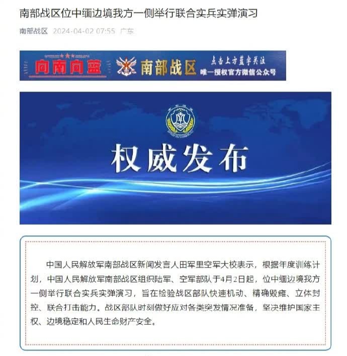 香港新聞網4月2日電 據微信公眾號“南部戰區”4月2日消息,中國人民解放軍南部戰區新聞發言人田軍里空軍大校表示,根據年度訓練計劃,中國人民解放軍南部戰區組織陸軍、空軍部隊於4月2日起,位中緬邊境中方一側舉行聯合實兵實彈演習,旨在檢驗戰區部隊快速機動、精確毀癱、立體封控、聯合打擊能力。戰區部隊時刻做好應對各類突發情況準備,堅決維護國家主權、邊境穩定和人民生命財產安全。