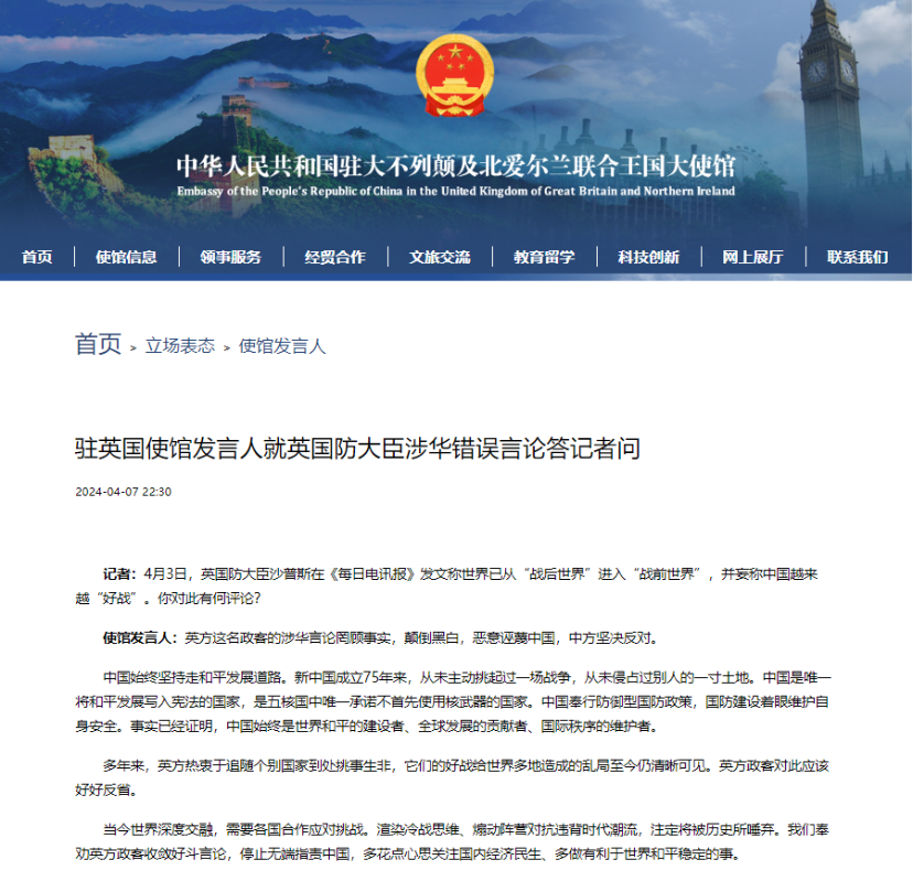 中國駐英國大使館網站截圖 記者:4月3日,英國防大臣沙普斯在《每日電訊報》發文稱世界已從“戰後世界”進入“戰前世界”,并妄稱中國越來越“好戰”。你對此有何評論? 使館發言人:英方這名政客的涉華言論罔顧事實,顛倒黑白,惡意誣衊中國,中方堅決反對。 中國始終堅持走和平發展道路。新中國成立75年來,從未主動挑起過一場戰爭,從未侵佔過別人的一寸土地。中國是唯一將和平發展寫入憲法的國家,是五核國中唯一承諾不首先使用核武器的國家。中國奉行防禦型國防政策,國防建設著眼維護自身安全。事實已經證明,中國始終是世界和平的建設者、全球發展的貢獻者、國際秩序的維護者。 多年來,英方熱衷於追隨個別國家到處挑事生非,它們的好戰給世界多地造成的亂局至今仍清晰可見。英方政客對此應該好好反省。 當今世界深度交融,需要各國合作應對挑戰。渲染冷戰思維、煽動陣營對抗違背時代潮流,注定將被歷史所唾棄。我們奉勸英方政客收斂好鬥言論,停止無端指責中國,多花點心思關注國內經濟民生、多做有利於世界和平穩定的事。(完) 【編輯:丘志彬】