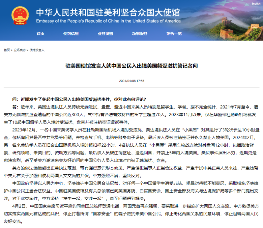 中國駐美國大使館網站截圖 2023年12月,一名中國來美訪學人員在杜勒斯國際機場入境時受滋擾,美邊境執法人員在“小黑屋”對其進行了3輪次長達10小時盤查,包括詢問其是否中共黨員等問題,并檢查其手機、電腦等隨身電子設備,最後該人員被註銷簽證并永久禁止入境美國。2024年2月,另一名來美訪學人員在舊金山國際機場入境時被扣押22小時,4名執法人員在“小黑屋”採用車輪戰連續對其盤問12小時,包括政治背景、研究領域、來美目的、資助方式等問題,最後該人員被註銷簽證、遣返回國,并禁止5年內入境美國。類似事件層出不窮,近期更是愈演愈烈,甚至受美方邀請來美友好訪問的中國公務人員入出境時也被無端滋擾、盤查。 美方的做法遠遠超出正常執法範圍,帶有強烈意識形態偏見,嚴重侵犯當事人正當合法權益,嚴重干擾中美正常人員來往,嚴重違背中美元首關於加強和便利兩國人文交流的共識。中方強烈不滿,堅決反對。 中國政府堅持以人民為中心,堅決維護中國公民合法權益,對任何一個中國留學生遭受非法、粗暴對待都不能容忍,採取措施堅決維護中國公民正當合法權益。中國駐美國使館及有關總領館已向美國務院、白宮國安會、國土安全部及海關與邊境保護局等多個部門提出交涉。對於此類案件,中方堅持“發生一起,交涉一起”,直至問題得到解決。 4月2日,中國國家主席習近平應約同美國總統拜登通電話,兩國元首再次強調,要採取進一步措施擴大兩國人文交流。中方敦促美方切實落實兩國元首達成的共識,停止打著所謂“國家安全”的幌子滋擾來美中國公民,停止毒化兩國關係的民意環境,停止阻礙兩國人民友好交流。(完) 【編輯:丘志彬】