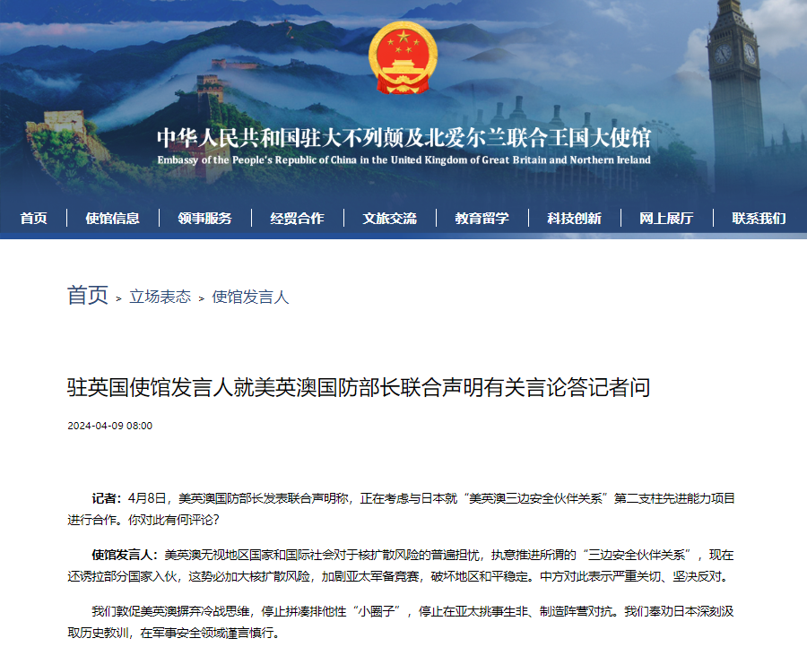 中國駐英國大使館網站截圖 有記者問:4月8日,美英澳國防部長發表聯合聲明稱,正在考慮與日本就“美英澳三邊安全夥伴關係”第二支柱先進能力項目進行合作。你對此有何評論? 中國駐英國使館發言人說,美英澳無視地區國家和國際社會對於核擴散風險的普遍擔憂,執意推進所謂的“三邊安全夥伴關係”,現在還誘拉部分國家入伙,這勢必加大核擴散風險,加劇亞太軍備競賽,破壞地區和平穩定。中方對此表示嚴重關切、堅決反對。 使館發言人強調,我們敦促美英澳摒棄冷戰思維,停止拼湊排他性“小圈子”,停止在亞太挑事生非、製造陣營對抗。我們奉勸日本深刻汲取歷史教訓,在軍事安全領域謹言慎行。(完) 【編輯:丘志彬】