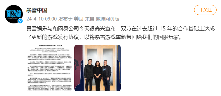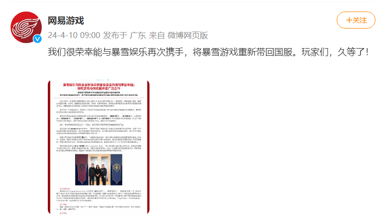 @暴雪中國 微博截圖 @網易遊戲 微博也官宣,暴雪旗下遊戲將於2024年夏季重返中國大陸市場,并表示:“我們很榮幸能與暴雪娛樂再次攜手,將暴雪遊戲重新帶回國服。玩家們,久等了!” 網易遊戲表示,經過過去一年的持續商討,暴雪娛樂與網易非常高興能够達成一致以在 未來繼續為國服玩家提供服務,并鄭重重申雙方對提供卓越游戲體驗的承諾。 更新後的遊戲出版協議將涵蓋玩家在之前協議下的各款國服遊戲:《魔獸世界》、《爐石傳說》,以及其他基於《魔獸爭霸》、《守望先鋒》、《暗黑破壞神》和《星際爭霸》各自游戲宇宙的系列遊戲。在過往已超十五年的合作基礎上,暴雪與網易正在努力制定回歸計劃,未來將公佈更多細節。