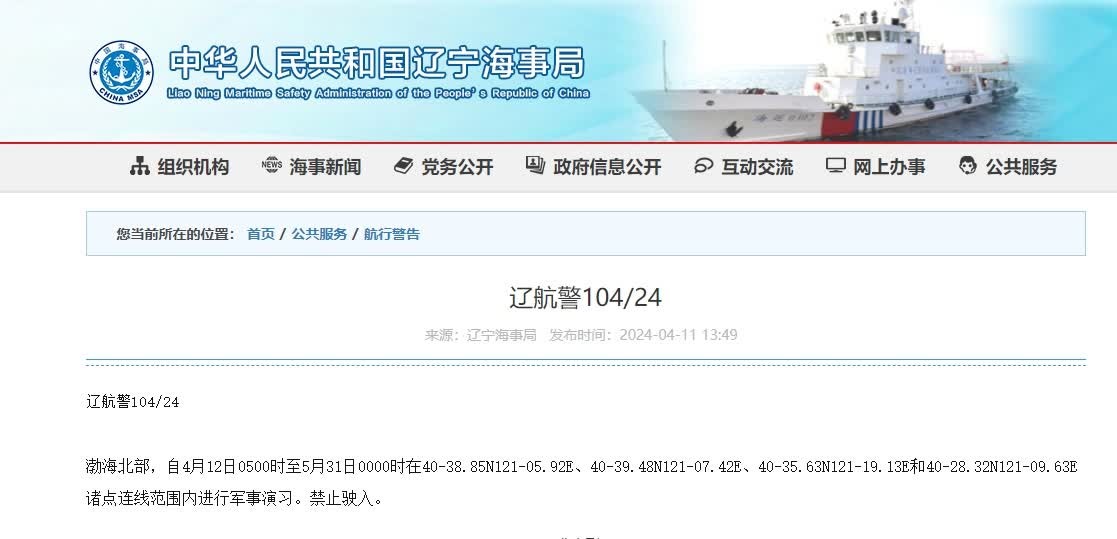 香港新聞網4月12日電 遼寧海事局發布航行警告,4月12日5時至5月31日0時,渤海部分海域將進行軍事演習。禁止駛入。