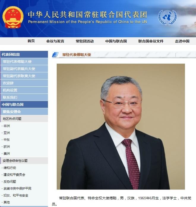 香港新聞網4月17日電 據中華人民共和國常駐聯合國代表團官網,傅聰已任中國常駐聯合國代表、特命全權大使。 根據該網站公佈的簡歷,傅聰,男,漢族,1965年6月生,法學學士,中共黨員。