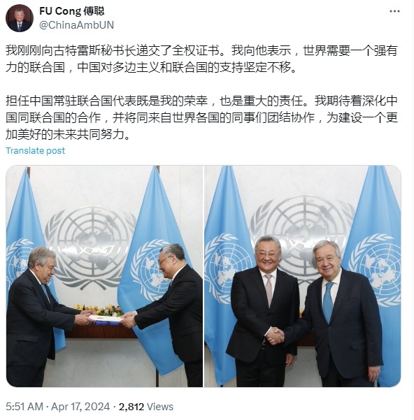 中國常駐聯合國代表團官網截圖 4月17日,傅聰在其社交媒體平台發文表示,他已經向聯合國秘書長古特雷斯遞交了全權證書,并向古特雷斯表示,世界需要一個強有力的聯合國,中國對多邊主義和聯合國的支持堅定不移。