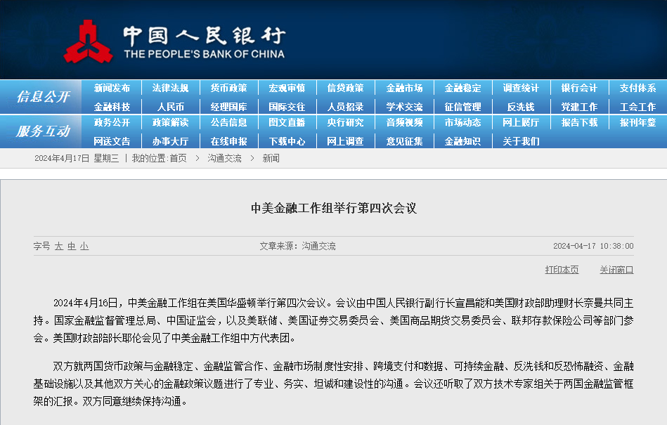 香港新聞網4月17日電 據中國人民銀行官網4月17日消息,4月16日,中美金融工作組在美國華盛頓舉行第四次會議。會議由中國人民銀行副行長宣昌能和美國財政部助理財長奈曼共同主持。中國國家金融監督管理總局、中國證監會,以及美聯儲、美國證券交易委員會、美國商品期貨交易委員會、聯邦存款保險公司等部門參會。美國財政部部長耶倫會見了中美金融工作組中方代表團。