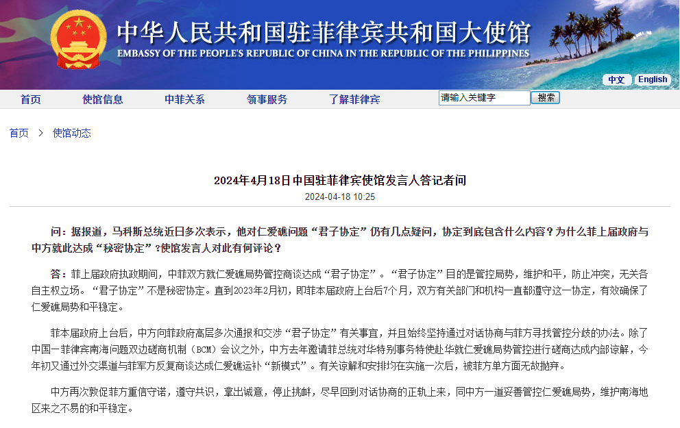 中國駐菲律賓大使館網站截圖 問:據報道,馬科斯總統近日多次表示,他對仁愛礁問題“君子協定”仍有幾點疑問,協定到底包含什麼內容?為什麼菲上屆政府與中方就此達成“秘密協定”?使館發言人對此有何評論? 答:菲上屆政府執政期間,中菲雙方就仁愛礁局勢管控商談達成“君子協定”。“君子協定”目的是管控局勢,維護和平,防止衝突,無關各自主權立場。“君子協定”不是秘密協定。直到2023年2月初,即菲本屆政府上台後7個月,雙方有關部門和機構一直都遵守這一協定,有效確保了仁愛礁局勢和平穩定。 菲本屆政府上台後,中方向菲政府高層多次通報和交涉“君子協定”有關事宜,并且始終堅持通過對話協商與菲方尋找管控分歧的辦法。除了中國—菲律賓南海問題雙邊磋商機制(BCM)會議之外,中方去年邀請菲總統對華特別事務特使赴華就仁愛礁局勢管控進行磋商達成內部諒解,今年初又通過外交渠道與菲軍方反復商談達成仁愛礁運補“新模式”。有關諒解和安排均在實施一次後,被菲方單方面無故拋棄。 中方再次敦促菲方重信守諾,遵守共識,拿出誠意,停止挑釁,盡早回到對話協商的正軌上來,同中方一道妥善管控仁愛礁局勢,維護南海地區來之不易的和平穩定。(完) 【編輯:丘志彬】