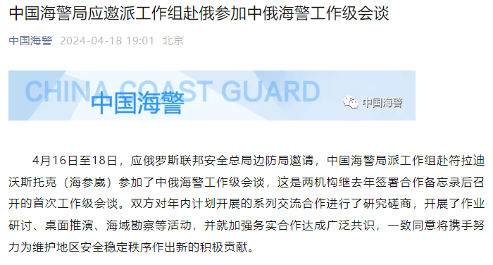 香港新聞網4月19日電 據中國海警微信公眾號18日消息,4月16日至18日,應俄羅斯聯邦安全總局邊防局邀請,中國海警局派工作組赴符拉迪沃斯托克(海參崴)參加了中俄海警工作級會談,這是兩機構繼去年簽署合作備忘錄後召開的首次工作級會談。雙方對年內計劃開展的系列交流合作進行了研究磋商,開展了作業研討、桌面推演、海域勘察等活動,并就加強務實合作達成廣泛共識,一致同意將攜手努力為維護地區安全穩定秩序作出新的積極貢獻。