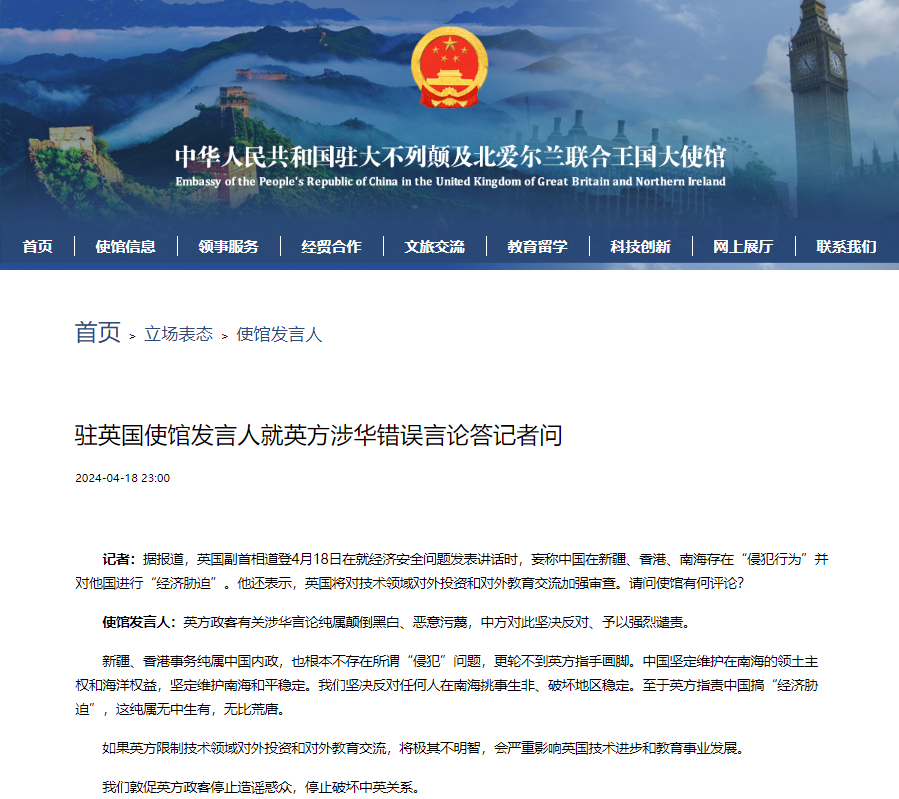 中國駐英大使館網站截圖 據中國駐英大使館消息,發言人指出,英方政客有關涉華言論純屬顛倒黑白、惡意污蔑,中方對此堅決反對、予以強烈譴責。 【編輯:丘志彬】