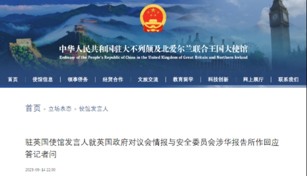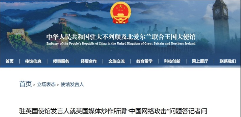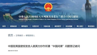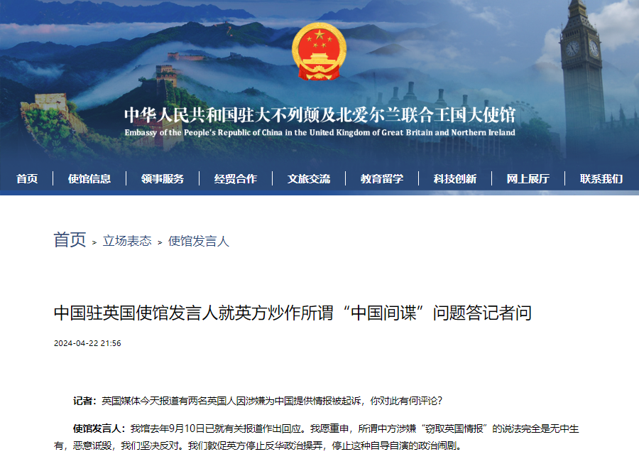 中國駐英國大使館網站截圖 據中國駐英國大使館官網消息,發言人表示,中使館去年9月10日已就有關報道作出回應。“我願重申,所謂中方涉嫌“竊取英國情報”的說法完全是無中生有,惡意詆毀,我們堅決反對。我們敦促英方停止反華政治操弄,停止這種自導自演的政治鬧劇。” 據英媒當地時間22日報道,英國有國會研究員及學者因涉嫌“替中國從事間諜活動”被起訴。上月,英國副首相道登向英議會通報,聲稱中國是一系列針對英國政治人士的網絡攻擊事件的所謂“幕後黑手”。此外,他還指責中國在2021年對英國選舉委員會發起過網絡攻擊。 對此,有專家表示,英國一向是炒作“中國間諜威脅”最起勁的國家之一,道登此次的指責也不意外。在毫無事實依據的情況下指責中國,只會影響兩國民眾的實際利益。(完) 【編輯:丘志彬】