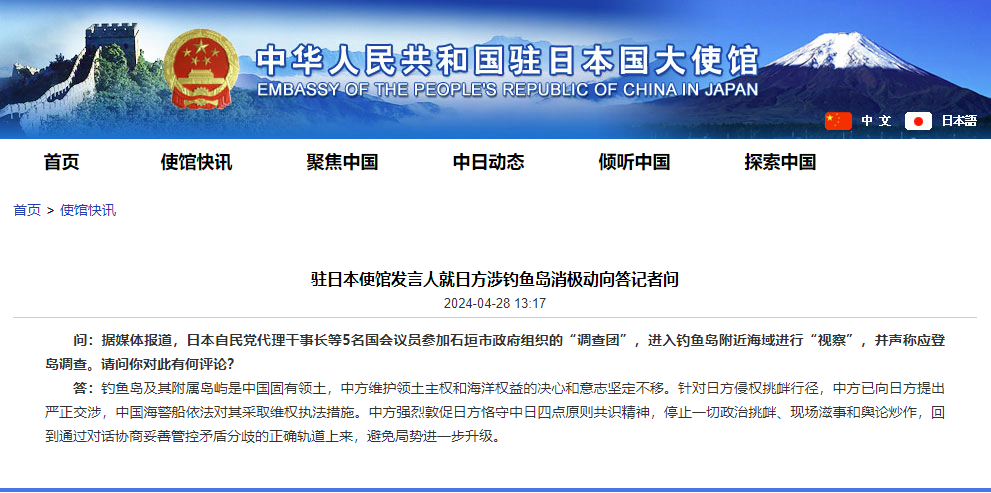 中國駐日本大使館網站截圖 記者問:據媒體報道,日本自民黨代理幹事長等5名國會議員參加石垣市政府組織的“調查團”,進入釣魚島附近海域進行“視察”,并聲稱應登島調查。對此有何評論? 中國駐日本使館發言人表示,釣魚島及其附屬島嶼是中國固有領土,中方維護領土主權和海洋權益的決心和意志堅定不移。針對日方侵權挑釁行徑,中方已向日方提出嚴正交涉,中國海警船依法對其採取維權執法措施。中方強烈敦促日方恪守中日四點原則共識精神,停止一切政治挑釁、現場滋事和輿論炒作,回到通過對話協商妥善管控矛盾分歧的正確軌道上來,避免局勢進一步昇級。(完) 【編輯:丘志彬】