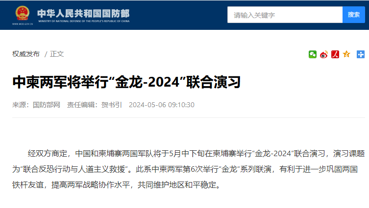 香港新聞網5月6日電 據中國國防部5月6日消息,經雙方商定,中國和柬埔寨兩國軍隊將於5月中下旬在柬埔寨舉行“金龍-2024”聯合演習,演習課題為“聯合反恐行動與人道主義救援”。