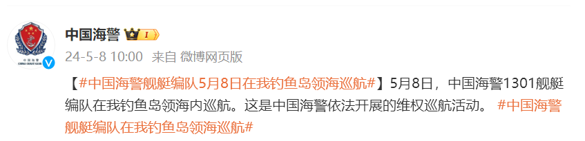 香港新聞網5月8日電 據中國海警局官方微博消息,5月8日,中國海警1301艦艇編隊在中國釣魚島領海內巡航。這是中國海警依法開展的維權巡航活動。