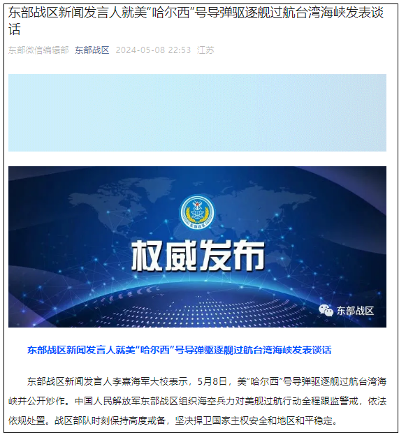 東部戰區新聞發言人李熹海軍大校表示,5月8日,美“哈爾西”號導彈驅逐艦過航台灣海峽並公開炒作。中國人民解放軍東部戰區組織海空兵力對美艦過航行動全程跟監警戒,依法依規處置。戰區部隊時刻保持高度戒備,堅決捍衛國家主權安全和地區和平穩定。(完)
