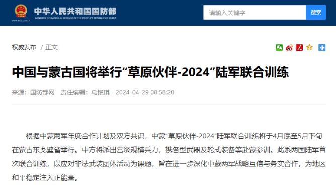 中方參訓官兵第三梯隊向宿營地域機動。解放軍報記者 劉丹 攝 據了解,此次聯合訓練,中方派出營級規模兵力,攜帶車輛裝備近百台。下一步,中蒙雙方將圍繞實兵行動展開具體磋商。 據“國防部發布”微信公眾號4月29日消息,根據中蒙兩軍年度合作計劃及雙方共識,中蒙“草原夥伴-2024”陸軍聯合訓練將於4月底至5月下旬在蒙古東戈壁省舉行。中方將派出營級規模兵力,攜各型武器及輪式裝備等赴蒙參訓。此系兩國陸軍首次聯合訓練,以應對非法武裝團體活動為課題,旨在進一步深化中蒙兩軍戰略互信與務實合作,為地區和平穩定注入正能量。(完) 【編輯:丘志彬】