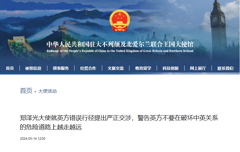中國駐英國大使館網站截圖 鄭澤光指出,5月13日,英方編造所謂案件,污蔑香港特區政府。一個時期以來,英方對中方的一系列指責,包括所謂“中國間諜案”、“中國網絡攻擊事件”等,均屬無中生有、惡意詆毀。英方還打著司法和國家安全旗號,任意對在英中國公民進行騷擾、逮捕和拘留。英方做法是對中方的嚴重挑釁,是對國際關係基本準則的嚴重違背,完全不可接受。 鄭澤光強調,香港早已回歸中國,香港是中國的香港。英方沒有權利、沒有資格對香港事務說三道四、橫加干涉。中國政府打擊反中亂港分子、維護香港穩定繁榮的決心堅定不移。英方庇護被通緝的違法犯罪分子是對法治的褻瀆,沒有任何出路。 鄭澤光敦促英方立即糾正錯誤,停止干涉中國內政,停止散布所謂“中國威脅”謊言,停止反華政治挑釁,停止針對在英中國公民的任意執法,確保所有在英中國機構及人員的安全和合法權益。中方正告英方,任何干涉中國內政、損害中方利益的行徑都會遭到中方堅決反擊。英方不要在破壞中英關係的錯誤道路上越走越遠。(完) 【編輯:丘志彬】