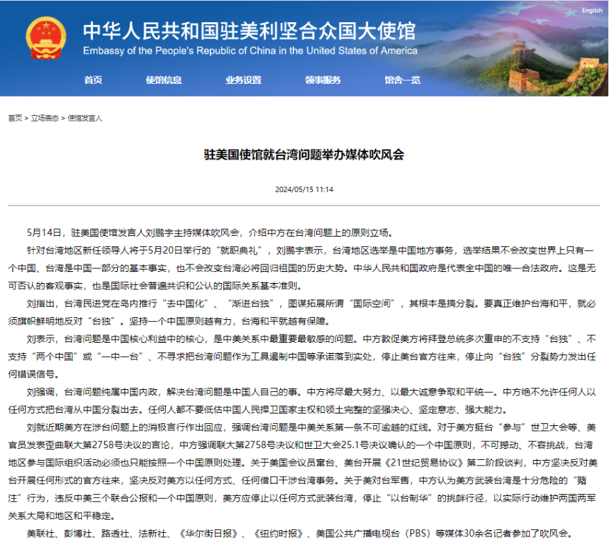 中國駐美國大使館網站截圖 針對台灣地區新任領導人將於5月20日舉行的“就職典禮”,劉鵬宇表示,台灣地區選舉是中國地方事務,選舉結果不會改變世界上只有一個中國、台灣是中國一部分的基本事實,也不會改變台灣必將回歸祖國的歷史大勢。中華人民共和國政府是代表全中國的唯一合法政府。這是無可否認的客觀事實,也是國際社會普遍共識和公認的國際關係基本準則。 劉指出,台灣民進黨在島內推行“去中國化”、“漸進台獨”,圖謀拓展所謂“國際空間”,其根本是搞分裂。要真正維護台海和平,就必須旗幟鮮明地反對“台獨”。堅持一個中國原則越有力,台海和平就越有保障。 劉表示,台灣問題是中國核心利益中的核心,是中美關係中最重要最敏感的問題。中方敦促美方將拜登總統多次重申的不支持“台獨”、不支持“兩個中國”或“一中一台”、不尋求把台灣問題作為工具遏制中國等承諾落到實處,停止美台官方往來,停止向“台獨”分裂勢力發出任何錯誤信號。 劉強調,台灣問題純屬中國內政,解決台灣問題是中國人自己的事。中方將盡最大努力、以最大誠意爭取和平統一。中方絕不允許任何人以任何方式把台灣從中國分裂出去。任何人都不要低估中國人民捍衛國家主權和領土完整的堅強決心、堅定意志、強大能力。 劉就近期美方在涉台問題上的消極言行作出回應,強調台灣問題是中美關係第一條不可逾越的紅線。對於美方挺台“參與”世衛大會等、美官員發表歪曲聯大第2758號決議的言論,中方強調聯大第2758號決議和世衛大會25.1號決議確認的一個中國原則,不可撼動、不容挑戰,台灣地區參與國際組織活動必須也只能按照一個中國原則處理。關於美國會議員竄台、美台開展《21世紀貿易協議》第二階段談判,中方堅決反對美台開展任何形式的官方往來,堅決反對美方以任何方式、任何藉口干涉台灣事務。關於美對台軍售,中方認為美方武裝台灣是十分危險的“賭注”行為,違反中美三個聯合公報和一個中國原則,美方應停止以任何方式武裝台灣,停止“以台制華”的挑釁行徑,以實際行動維護兩國兩軍關係大局和地區和平穩定。 美聯社、彭博社、路透社、法新社、《華爾街日報》、《紐約時報》、美國公共廣播電視台(PBS)等媒體30餘名記者參加了吹風會。(完) 【編輯:丘志彬】